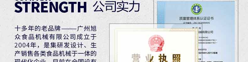 廣州旭眾食品機(jī)械有限公司是一家集科研開發(fā),生產(chǎn)設(shè)計(jì),營(yíng)銷服務(wù)為一體的現(xiàn)代化生產(chǎn)企業(yè)。現(xiàn)代化生產(chǎn)車間,精湛制造技術(shù),所產(chǎn)機(jī)械歷經(jīng)市場(chǎng)重重考驗(yàn),不斷贏得海內(nèi)外客戶的贊譽(yù)。