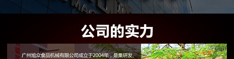 廣州旭眾食品機(jī)械有限公司是一家集科研開發(fā),生產(chǎn)設(shè)計(jì),營銷服務(wù)為一體的現(xiàn)代化生產(chǎn)企業(yè)?,F(xiàn)代化生產(chǎn)車間,精湛制造技術(shù),所產(chǎn)機(jī)械歷經(jīng)市場重重考驗(yàn),不斷贏得海內(nèi)外客戶的贊譽(yù)。
