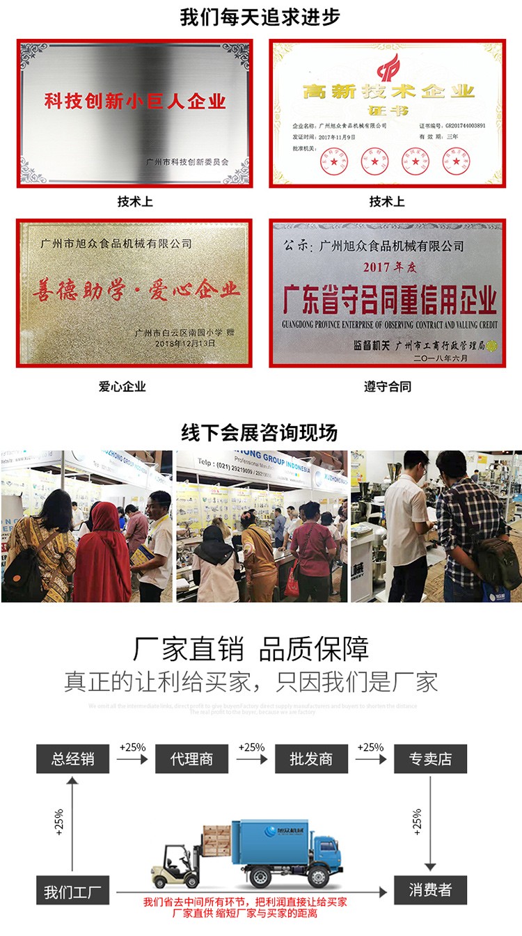 廣州旭眾食品機(jī)械有限公司是一家集科研開(kāi)發(fā),生產(chǎn)設(shè)計(jì),營(yíng)銷服務(wù)為一體的現(xiàn)代化生產(chǎn)企業(yè)。現(xiàn)代化生產(chǎn)車間,精湛制造技術(shù),所產(chǎn)機(jī)械歷經(jīng)市場(chǎng)重重考驗(yàn),不斷贏得海內(nèi)外客戶的贊譽(yù)。