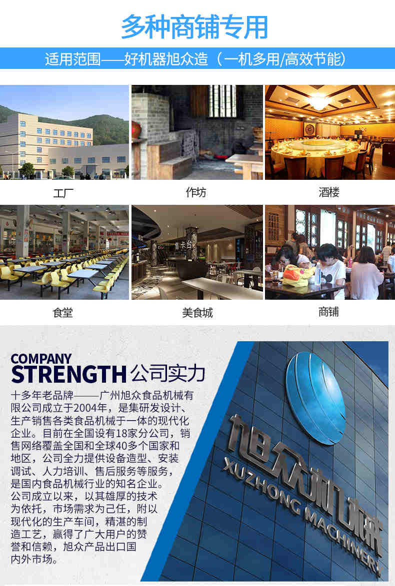 廣州旭眾食品機械有限公司是一家集科研開發(fā),生產(chǎn)設(shè)計,營銷服務(wù)為一體的現(xiàn)代化生產(chǎn)企業(yè)。現(xiàn)代化生產(chǎn)車間,精湛制造技術(shù),所產(chǎn)機械歷經(jīng)市場重重考驗,不斷贏得海內(nèi)外客戶的贊譽。