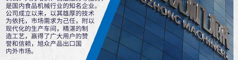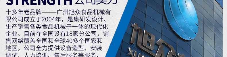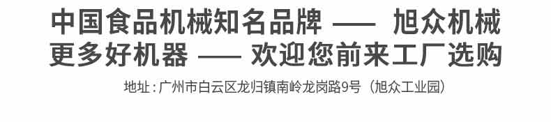 廣州旭眾食品機(jī)械有限公司是一家集科研開發(fā),生產(chǎn)設(shè)計,營銷服務(wù)為一體的現(xiàn)代化生產(chǎn)企業(yè)。現(xiàn)代化生產(chǎn)車間,精湛制造技術(shù),所產(chǎn)機(jī)械歷經(jīng)市場重重考驗,不斷贏得海內(nèi)外客戶的贊譽(yù)。