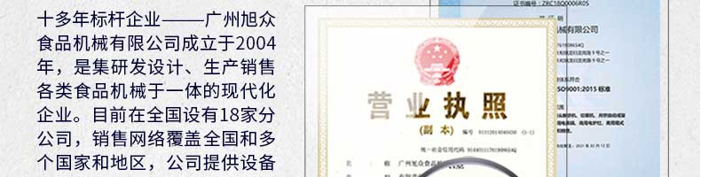 廣州旭眾食品機(jī)械有限公司是一家集科研開發(fā),生產(chǎn)設(shè)計(jì),營(yíng)銷服務(wù)為一體的現(xiàn)代化生產(chǎn)企業(yè)。現(xiàn)代化生產(chǎn)車間,精湛制造技術(shù),所產(chǎn)機(jī)械歷經(jīng)市場(chǎng)重重考驗(yàn),不斷贏得海內(nèi)外客戶的贊譽(yù)。