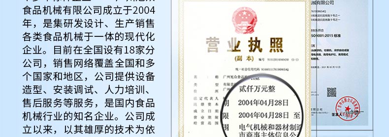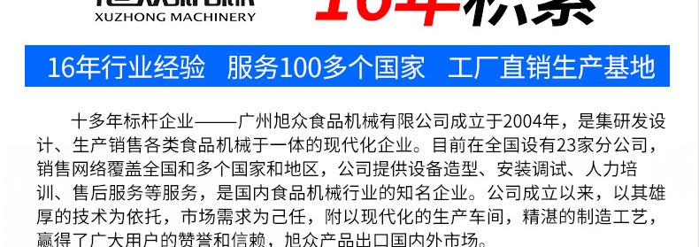 廣州旭眾食品機械有限公司是一家集科研開發(fā),生產(chǎn)設(shè)計,營銷服務(wù)為一體的現(xiàn)代化生產(chǎn)企業(yè)?,F(xiàn)代化生產(chǎn)車間,精湛制造技術(shù),所產(chǎn)機械歷經(jīng)市場重重考驗,不斷贏得海內(nèi)外客戶的贊譽。