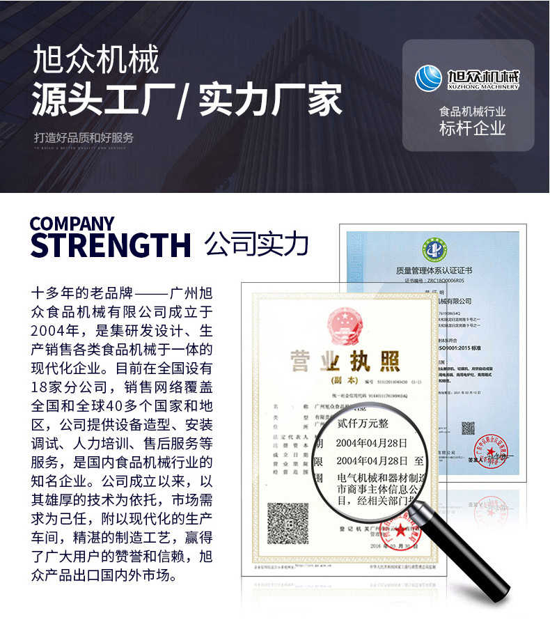廣州旭眾食品機(jī)械有限公司是一家集科研開(kāi)發(fā),生產(chǎn)設(shè)計(jì),營(yíng)銷服務(wù)為一體的現(xiàn)代化生產(chǎn)企業(yè)。現(xiàn)代化生產(chǎn)車間,精湛制造技術(shù),所產(chǎn)機(jī)械歷經(jīng)市場(chǎng)重重考驗(yàn),不斷贏得海內(nèi)外客戶的贊譽(yù)。