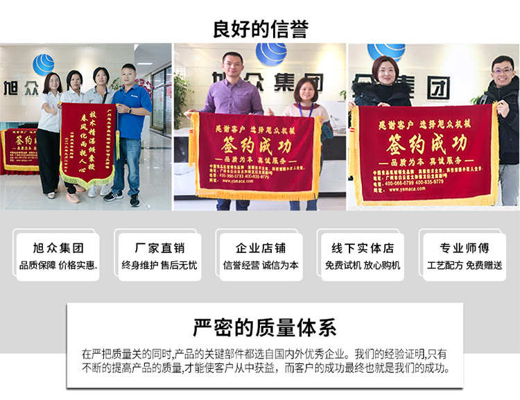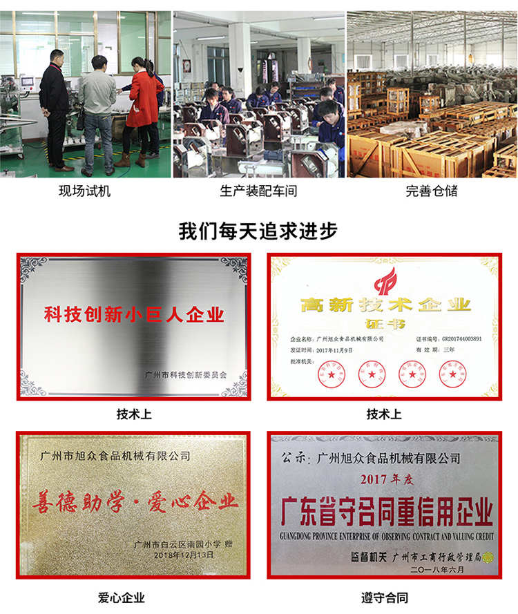 廣州旭眾食品機械有限公司是一家集科研開發(fā),生產(chǎn)設(shè)計,營銷服務(wù)為一體的現(xiàn)代化生產(chǎn)企業(yè)?,F(xiàn)代化生產(chǎn)車間,精湛制造技術(shù),所產(chǎn)機械歷經(jīng)市場重重考驗,不斷贏得海內(nèi)外客戶的贊譽。