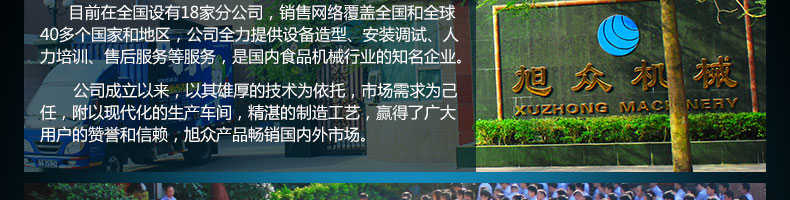 廣州旭眾食品機械有限公司是一家集科研開發(fā),生產(chǎn)設(shè)計,營銷服務(wù)為一體的現(xiàn)代化生產(chǎn)企業(yè)。現(xiàn)代化生產(chǎn)車間,精湛制造技術(shù),所產(chǎn)機械歷經(jīng)市場重重考驗,不斷贏得海內(nèi)外客戶的贊譽。