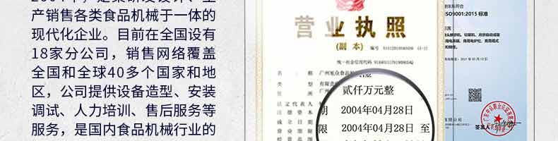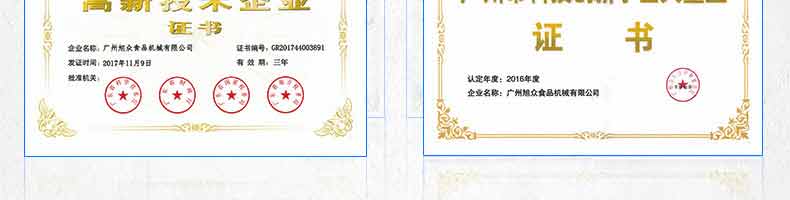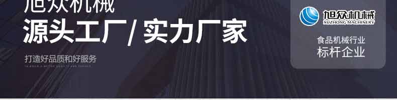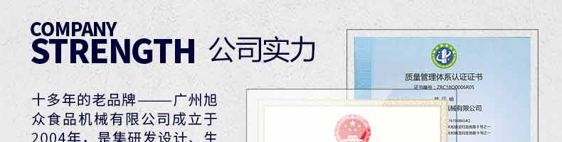 廣州旭眾食品機械有限公司是一家集科研開發(fā),生產設計,營銷服務為一體的現(xiàn)代化生產企業(yè)?,F(xiàn)代化生產車間,精湛制造技術,所產機械歷經市場重重考驗,不斷贏得海內外客戶的贊譽。