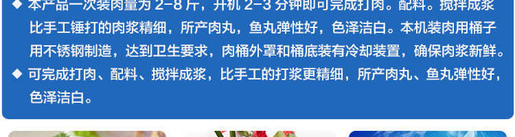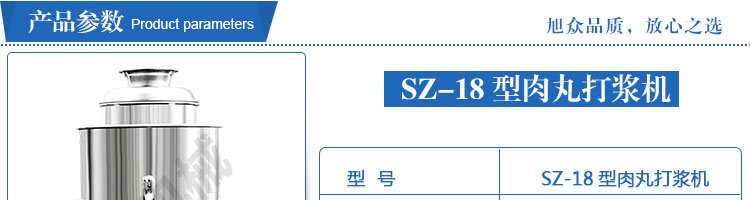 SZ-18型肉丸打漿機(jī),本機(jī)裝肉用桶子采用不銹鋼制造,達(dá)到衛(wèi)生要求,肉桶外罩和桶底裝有冷卻裝置,確保肉漿新鮮。比手工的打漿更精細(xì),所產(chǎn)肉丸、魚(yú)丸彈性好,色澤潔白。