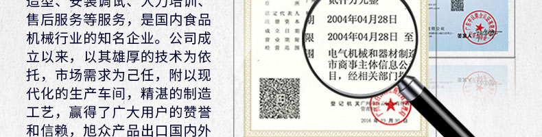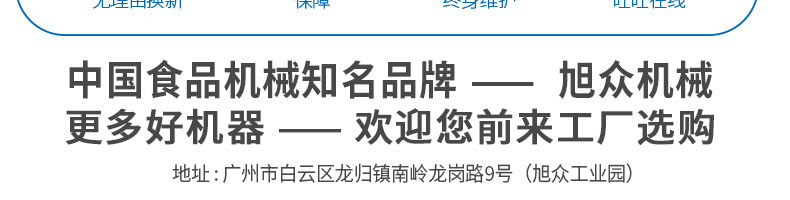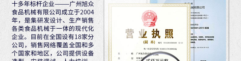 廣州旭眾食品機(jī)械有限公司是一家集科研開發(fā),生產(chǎn)設(shè)計(jì),營銷服務(wù)為一體的現(xiàn)代化生產(chǎn)企業(yè)?,F(xiàn)代化生產(chǎn)車間,精湛制造技術(shù),所產(chǎn)機(jī)械歷經(jīng)市場重重考驗(yàn),不斷贏得海內(nèi)外客戶的贊譽(yù)。