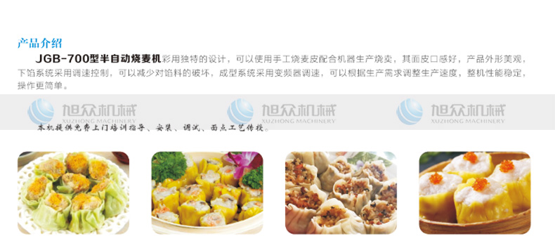 JGB-700燒麥機(jī),采用特的設(shè)計(jì),可以使用手工燒麥皮配合機(jī)器生產(chǎn)燒賣(mài),其面皮口感好,產(chǎn)品外形美觀下餡系統(tǒng)采用調(diào)速控制,可以減少對(duì)餡料的破壞,成型系統(tǒng)呆用變頻器調(diào)速,可以根據(jù)生產(chǎn)需求調(diào)整生產(chǎn)速度,整機(jī)性能穩(wěn)定操作更簡(jiǎn)單