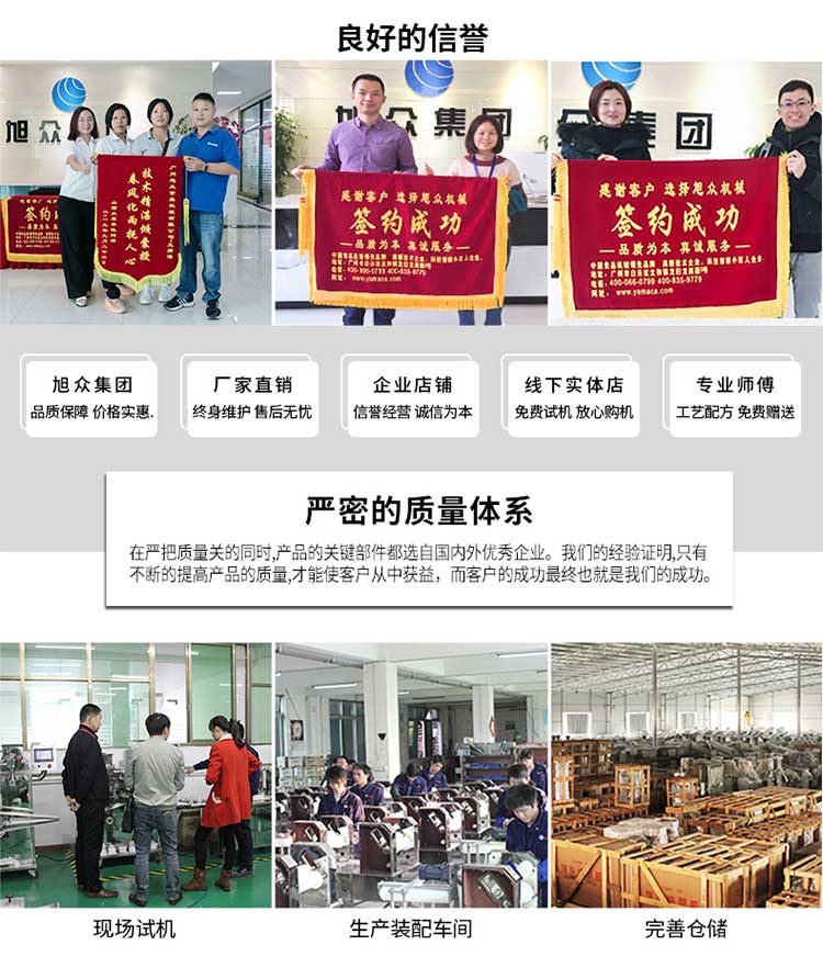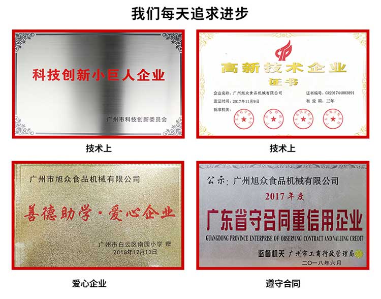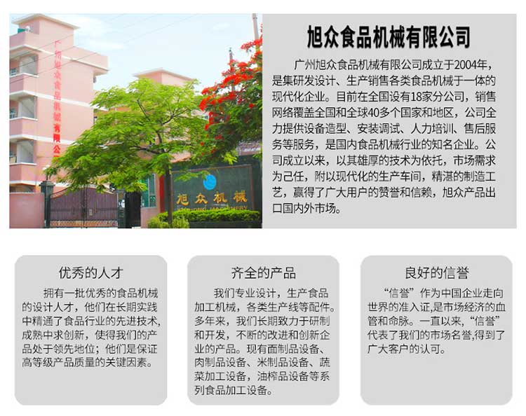 廣州旭眾食品機械有限公司是一家集科研開發(fā),生產設計,營銷服務為一體的現(xiàn)代化生產企業(yè)?,F(xiàn)代化生產車間,精湛制造技術,所產機械歷經市場重重考驗,不斷贏得海內外客戶的贊譽。