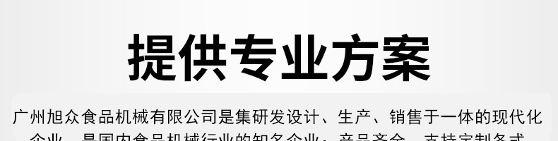 廣州旭眾食品機械有限公司是一家集科研開發(fā),生產(chǎn)設計,營銷服務為一體的現(xiàn)代化生產(chǎn)企業(yè)?,F(xiàn)代化生產(chǎn)車間,精湛制造技術,所產(chǎn)機械歷經(jīng)市場重重考驗,不斷贏得海內(nèi)外客戶的贊譽。