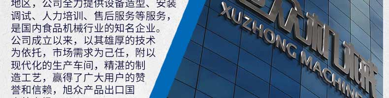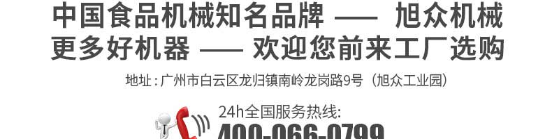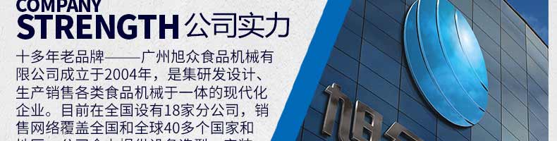 廣州旭眾食品機(jī)械有限公司是一家集科研開發(fā),生產(chǎn)設(shè)計,營銷服務(wù)為一體的現(xiàn)代化生產(chǎn)企業(yè)。現(xiàn)代化生產(chǎn)車間,精湛制造技術(shù),所產(chǎn)機(jī)械歷經(jīng)市場重重考驗,不斷贏得海內(nèi)外客戶的贊譽(yù)。