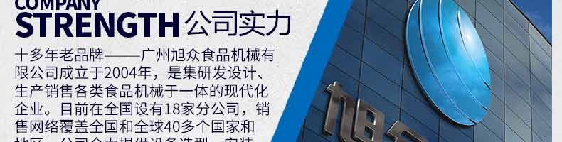 廣州旭眾食品機(jī)械有限公司是一家集科研開(kāi)發(fā),生產(chǎn)設(shè)計(jì),營(yíng)銷服務(wù)為一體的現(xiàn)代化生產(chǎn)企業(yè)?,F(xiàn)代化生產(chǎn)車間,精湛制造技術(shù),所產(chǎn)機(jī)械歷經(jīng)市場(chǎng)重重考驗(yàn),不斷贏得海內(nèi)外客戶的贊譽(yù)。